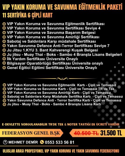 3 SERTİFİKA 1 ÇİPLİ KART VİP YAKIN KORUMA VE YAKIN SAVUNMA PAKETİ